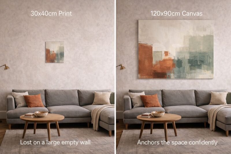 The reason this happens is obvious once you spot it: small art is cheaper and easier to handle than large art. A 40x50cm print from a high street shop is affordable, fits under your arm, and requires one nail. A 100x140cm canvas requires real investment, careful transportation, and proper installation. So people buy small and the walls look bare.