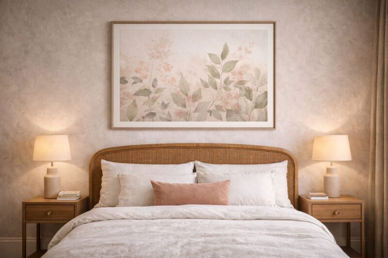 The bedroom is a restorative space, and the art in it should support that function. Research from environmental psychology consistently shows that calm, lower-contrast images — natural scenes, soft abstract compositions, botanical prints in muted tones — contribute to lower pre-sleep arousal and better sleep quality.