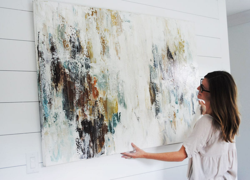 A large statement piece above a fireplace or sofa should be the design anchor from which other choices in the room (cushion colours, accessories, secondary art pieces) derive.